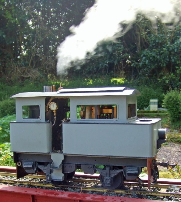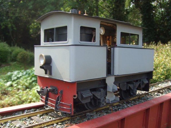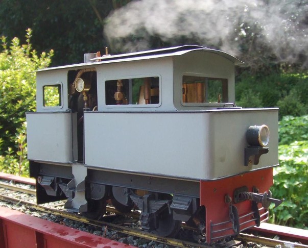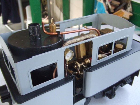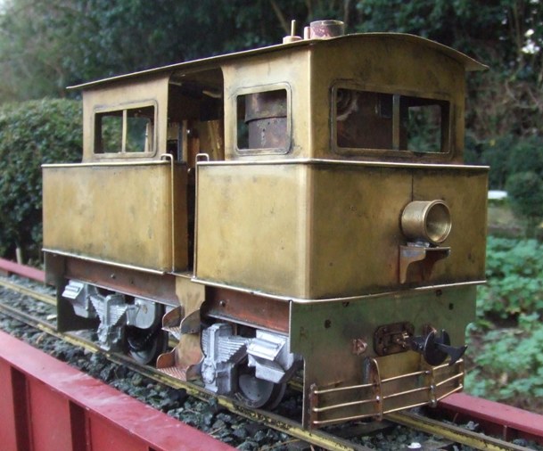 You can see the general layout above – the reversing handle is clearly visible on the top of the engine – the gas valve is in the bottom R/H of the cab, with the displacement lubricator (draining through the cab floor) on the opposite side. The regulator is in the cab doorway, just above one of the two drive chains. John made the sole bars from old brass curtain rod, which looks just like the real thing. | ||
